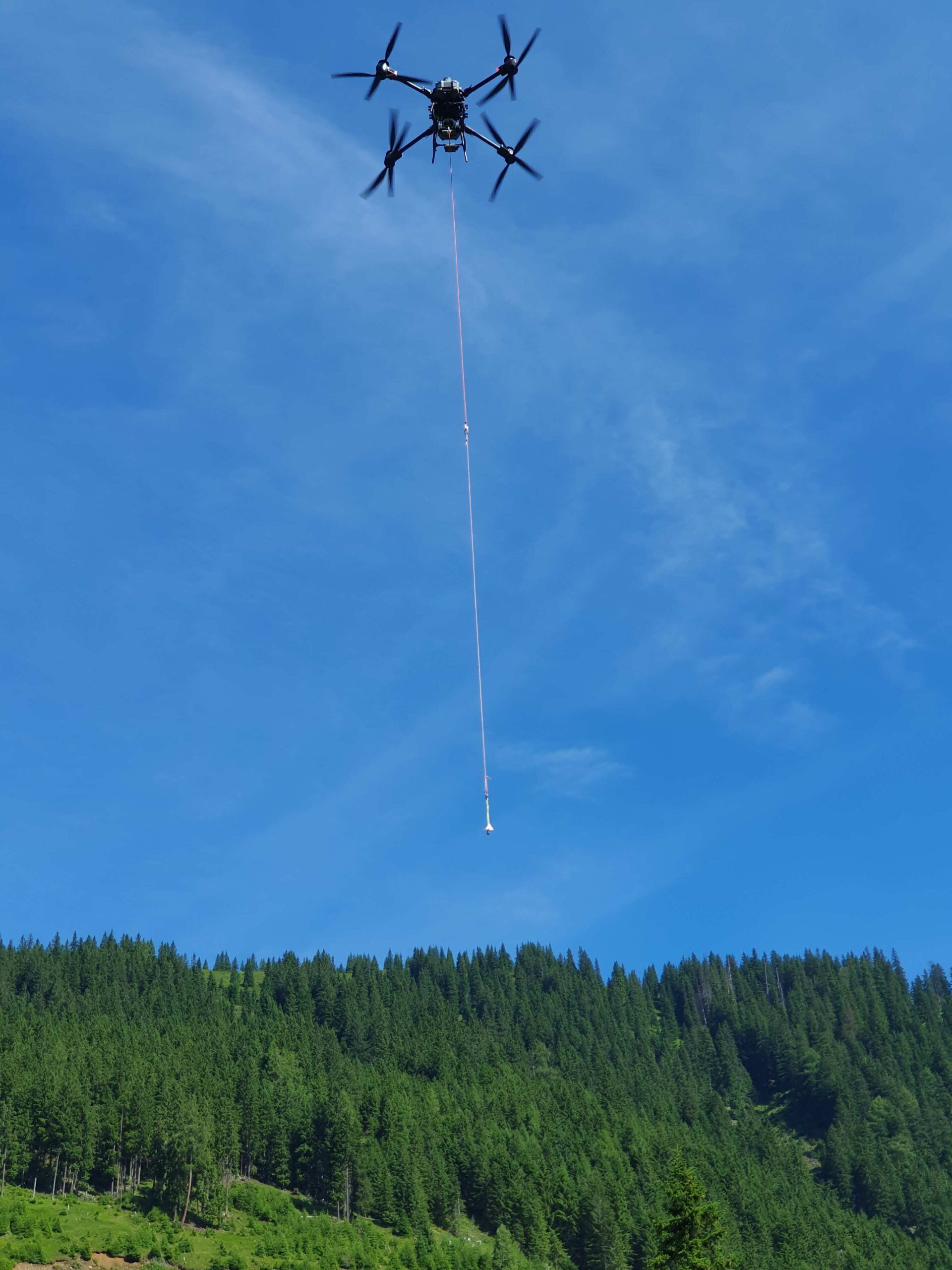 Unsere leistungsstarke Drohne transportiert Lasten bis zu 40 kg über Entfernungen von bis zu 2000m – effizient, zuverlässig und vollkommen genehmigt. Mit modernster Funkhaken-Technologie liefern wir Material präzise ab, ohne dass Personal vor Ort sein muss. Ideal für Forstwirtschaft, Bauprojekte und Speziallogistik in unwegsamem Gelände.