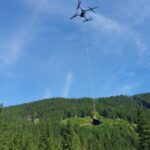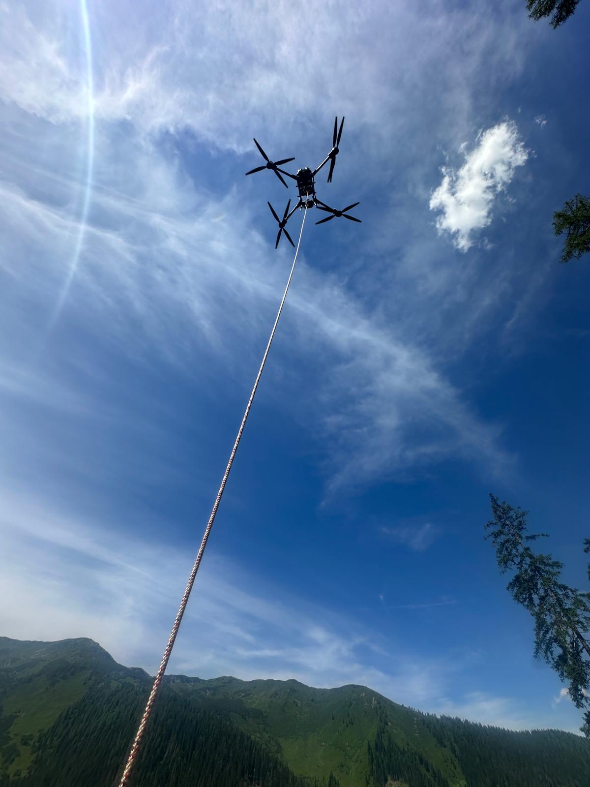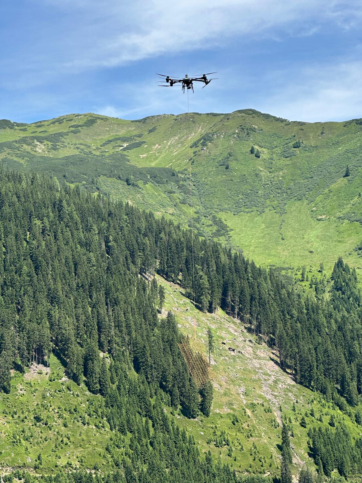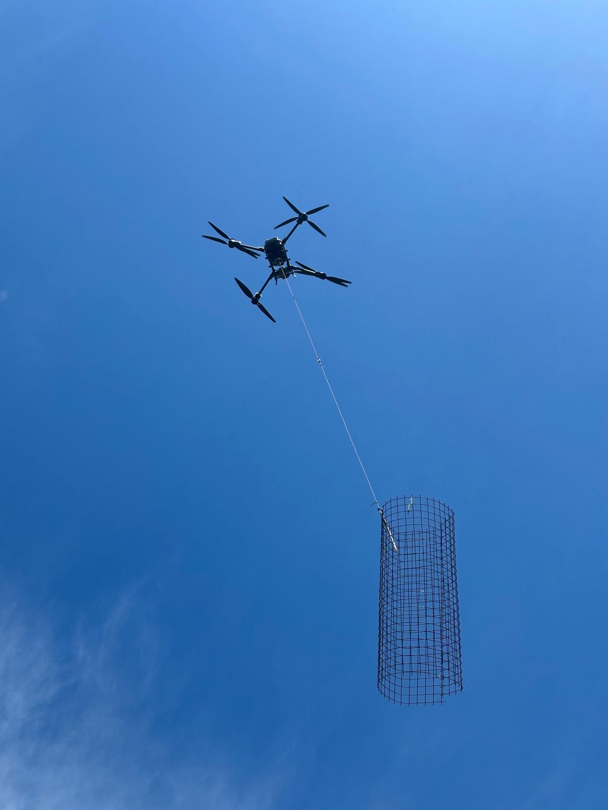 Vorteil: Der Transport per Drohne ist deutlich effizienter als manuell und spart Personal, da große Mengen Material ohne körperlichen Aufwand bewegt werden können. Arbeiten schneller umgesetzt.