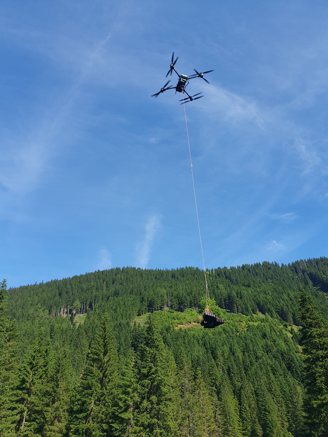 Antwort: Unsere Drohne kann alle festen Materialien bis zu 40 kg transportieren – darunter Baumsetzlinge, Holzpfähle, Verbissschutz, Werkzeuge oder kleinere Baumaterialien. Aus Sicherheitsgründen sind der Transport von Flüssigkeiten sowie gefährlichen Stoffen ausgeschlossen. Für eine flexible Handhabung stehen uns verschiedene Anschlagmittel wie Big Bags, Schlingen oder Netze zur Verfügung, sodass wir unterschiedlichste Materialien sicher und effizient befördern können.