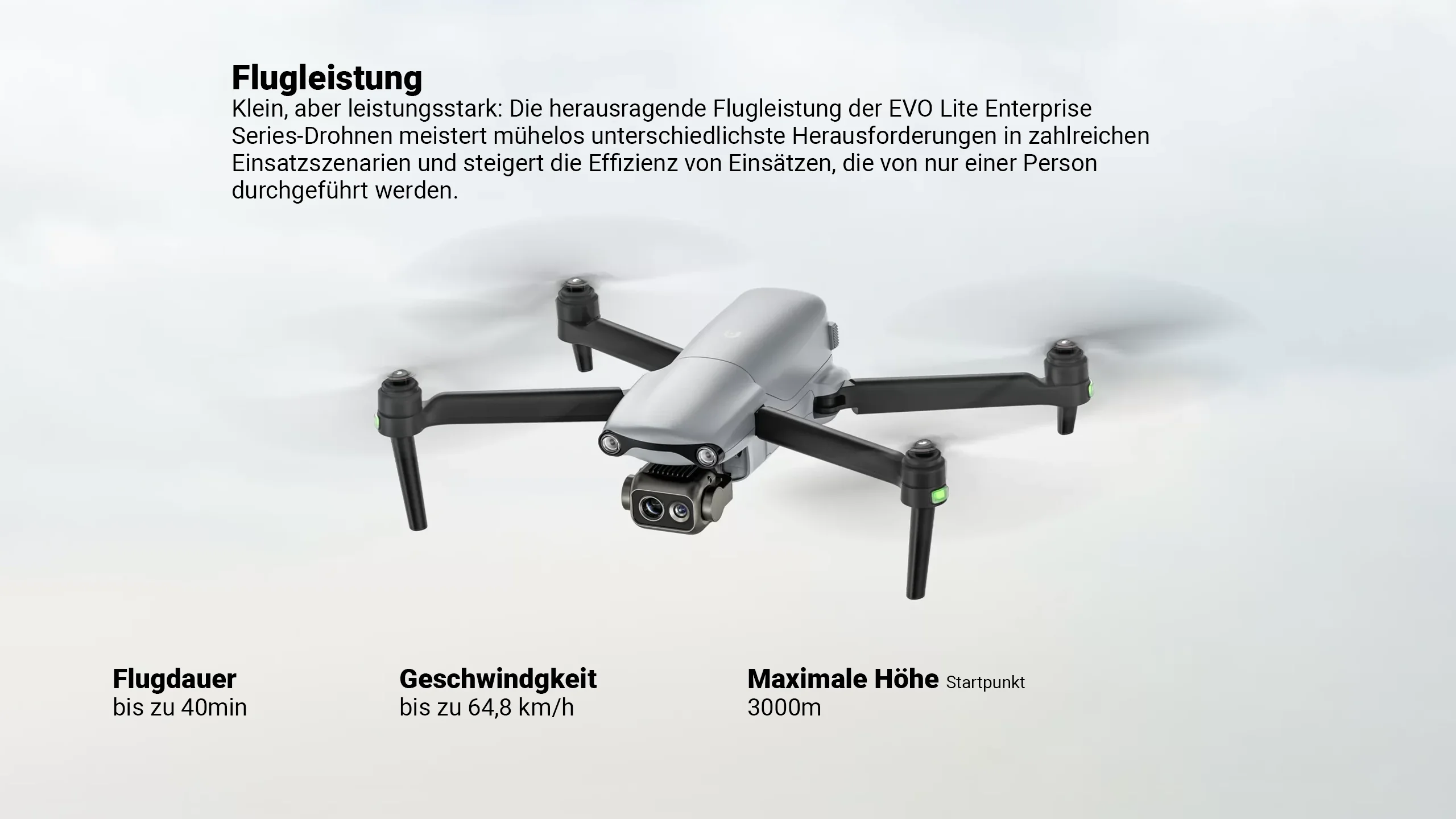 Die Drohnen der EVO Lite Enterprise Serie wiegen nur 866 Gramm und haben zusammengeklappt Abmessungen von nur 210 × 123 × 95 mm, wodurch sie problemlos in einem Rucksack transportiert werden können. Durch die einfache Bedienung eignen sie sich ideal für die effiziente Durchführung von Einsätzen durch einen einzelnen Operator.