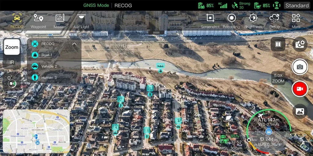 Durch den Einsatz von Weitwinkel- oder Infrarotlinsen in Kombination mit intelligenten KI-Algorithmen und einem selbstlernenden System kann die Drohne automatisch Ziele wie Personen, Autos oder Boote erkennen und deren Positionen auf der Karte anzeigen.
